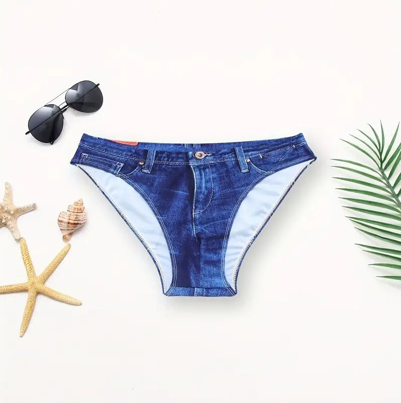 ジーンズプリントのビキニパンツ。つるっとして履きやすい。